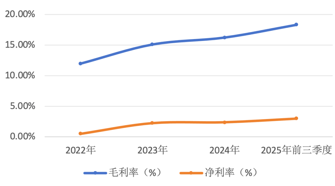 另外,投资时间网、标点财经研究员注意到,自2022年以来,该公司毛利率就在稳步增长,但公司净利率变动不大,2023年、2024年均为2.4%以下水平。2025年前三季度,公司净利率为2.97%,同比还有所减少。究其原因,离不开公司期间费用率未能缩减影响。