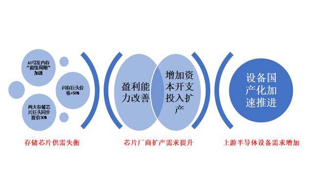 从产业链角度看,半导体设备属于存储芯片的上游领域。当存储芯片因为供需失衡持续上调涨价后,芯片厂商盈利能力改善、存在扩产与增加资本开支的必要性,上游设备需求将会受益,从而有望提升订单并加速国产化推进。