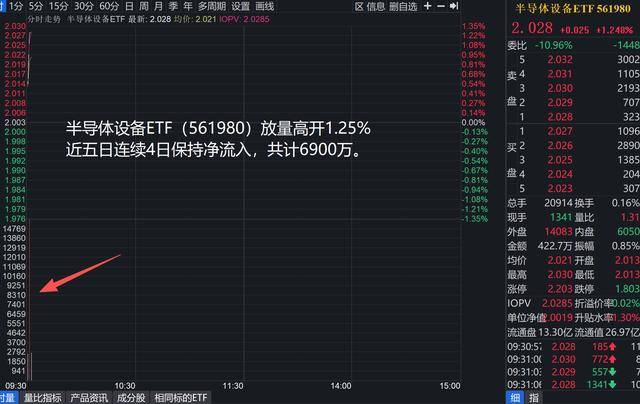 11月11日,三大指数红开,存储芯片涨价潮下,相关板块接连走强。数据显示,上游半导体设备ETF(561980)日K成功录得六连阳,最近五个交易日内累计“吸金”4天,共计净流入6900万元。