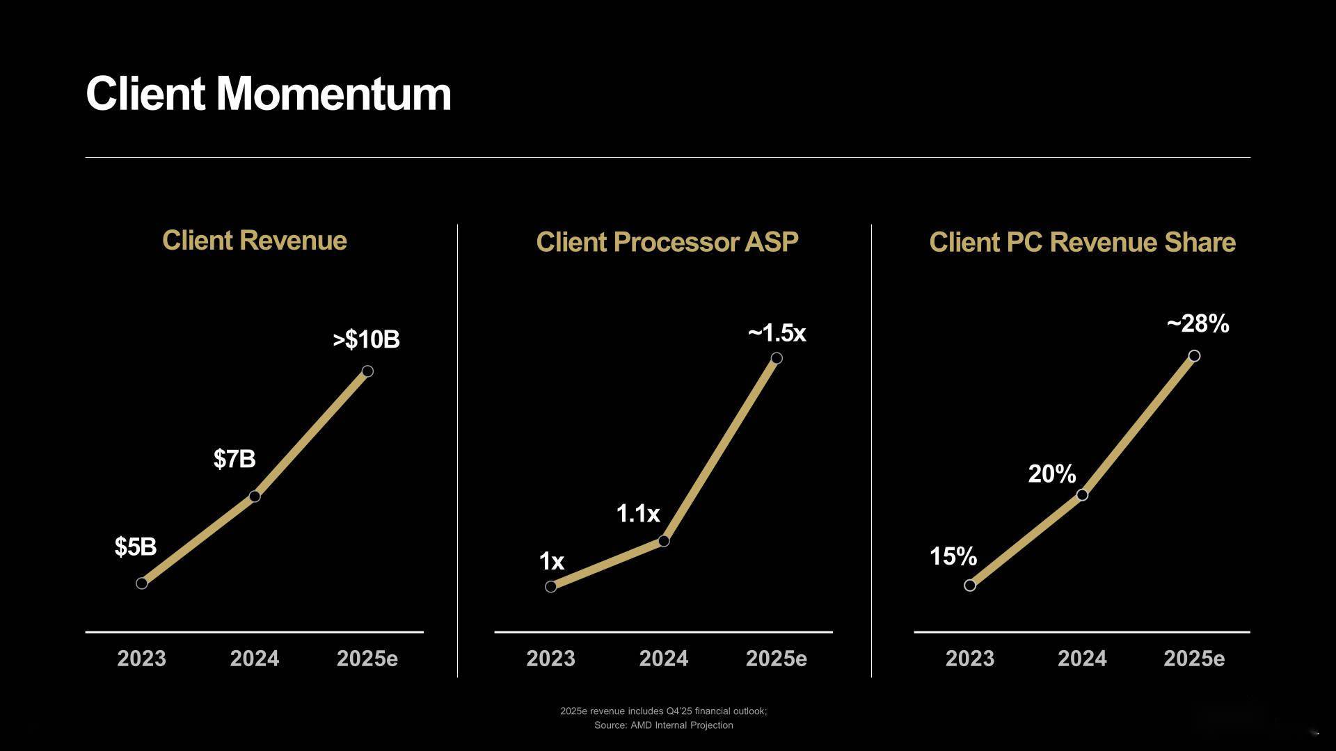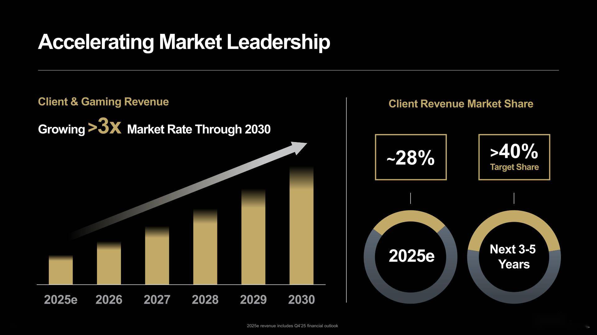 AMD 预计其客户端和游戏业务在 2025 年将可实现超过 140 亿美元的合计营收,同比增长超过 50%;其客户端 PC 营收市场占比已从 2023 年的 15% 成长至今年的约 28%,目标在中期超过 40%。