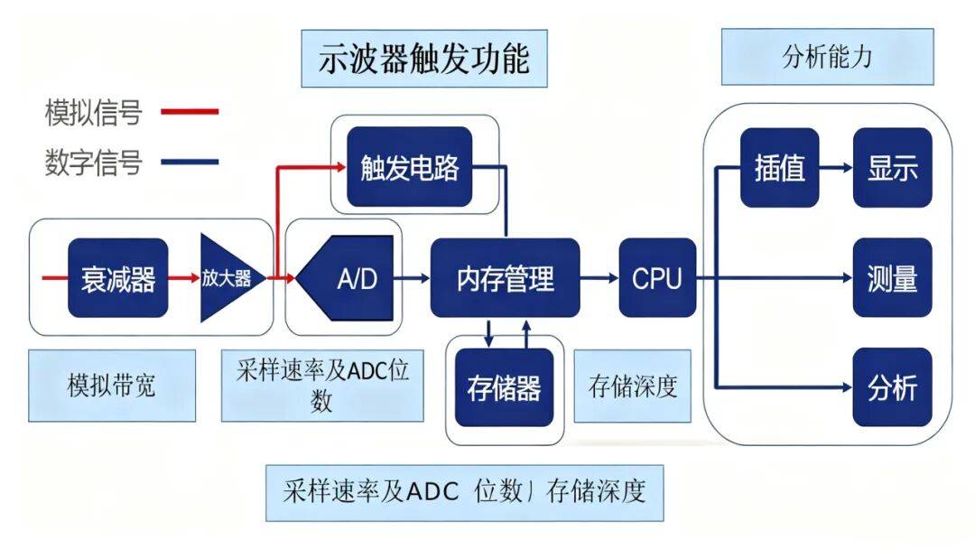 示波器触发功能允许您在特定时间点启动示波器的测量扫描。这对于捕获周期性信号或研究瞬态事件非常有用。您可以配置触发器,使其在信号的上升沿或下降沿,或任何输入通道上的特定电压电平上启动扫描。您还可以设置触发器,使其在输入信号超出特定电压范围时启动扫描。