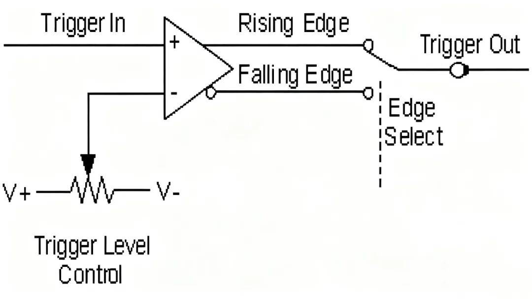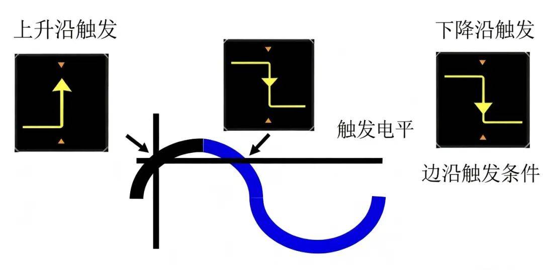 边沿触发是示波器默认的触发条件,示波器将输入信号与预先设置的触发电平进行比较,当信号由低于阀值电平变换到高于阀值电平时,即是上升沿触发,反之则为下降沿触发。