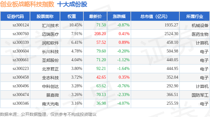 证券之星消息,11月12日,创业板战略科技(971004)指数报收于6192.07点,跌0.73%,成交258.6亿元,换手率2.81%。当日该指数成份股中,上涨的有20家,联动科技以6.59%的涨幅领涨,下跌的有30家,南大光电以4.07%的跌幅领跌。