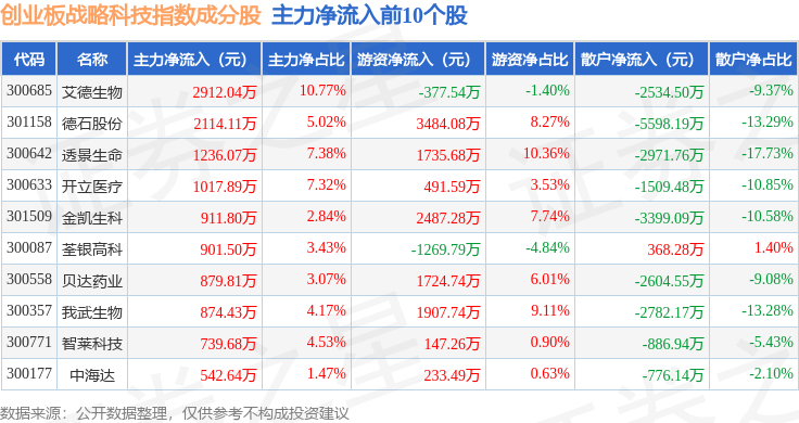 资金流向方面,创业板战略科技(971004)指数成份股当日主力资金净流出合计13.56亿元,游资资金净流入合计2.89亿元,散户资金净流入合计10.67亿元。成份股资金流向详情见下表: