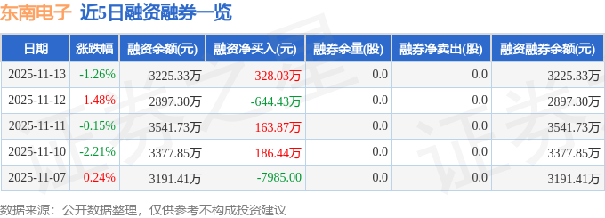 东南电子融资融券信息显示,融资方面,当日融资买入463.53万元,融资偿还135.5万元,融资净买入328.03万元。融券方面,融券卖出0.0股,融券偿还0.0股,融券余量0.0股,融券余额0.0万元。融资融券余额3225.33万元。