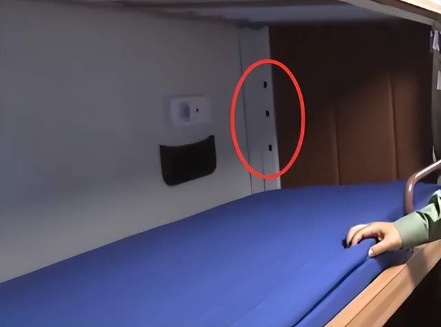 我们放大这个画面仔细靠就会发现,这个三层铺其实是可以活动的,中铺和上铺是通过插销固定的,而且可以调整高度。虽然三层铺的空间很有限,没什么调整空间,但是如果去掉其中一层铺面,就可以快速改装成空间更大的两层铺。