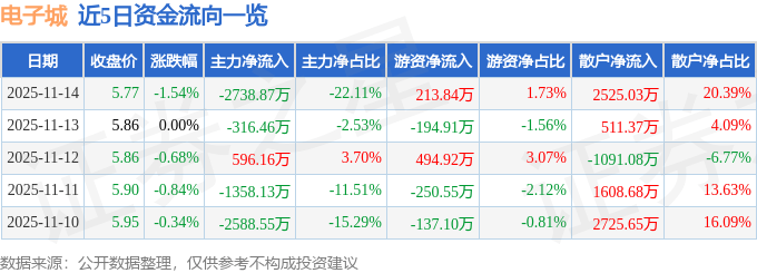 11月14日的资金流向数据方面,主力资金净流出2738.87万元,占总成交额22.11%,游资资金净流入213.84万元,占总成交额1.73%,散户资金净流入2525.03万元,占总成交额20.39%。