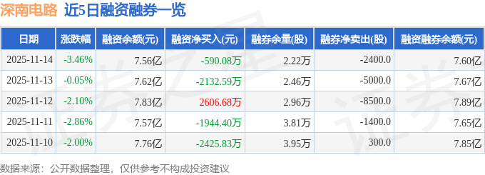 深南电路融资融券信息显示,融资方面,当日融资买入7241.55万元,融资偿还7831.64万元,融资净偿还590.08万元。融券方面,融券卖出100.0股,融券偿还2500.0股,融券余量2.22万股,融券余额445.31万元。融资融券余额7.6亿元。