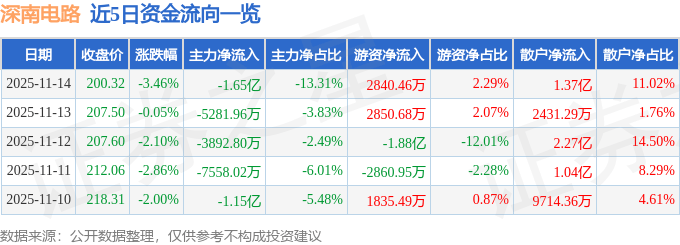 证券之星消息,截至2025年11月14日收盘,深南电路(002916)报收于200.32元,下跌3.46%,换手率0.93%,成交量6.16万手,成交额12.43亿元。