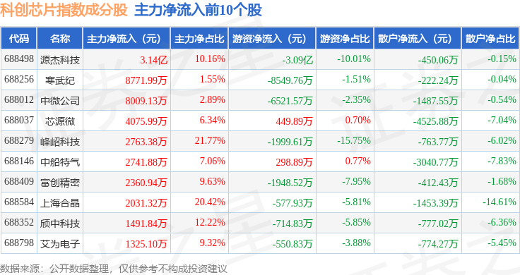 资金流向方面,科创芯片(000685)指数成份股当日主力资金净流出合计24.35亿元,游资资金净流入合计8.27亿元,散户资金净流入合计16.08亿元。成份股资金流向详情见下表: