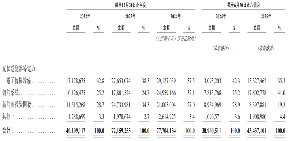 招股书显示,储能系统业务收入在2025年上半年同比暴增127.78%至178.03亿元,占营收的比例同比增长15.5个百分点至41.0%。相比之下,作为曾经的核心业务,光伏逆变器业务收入同比增长仅17.06%至153.27亿元,占营收的比例同比下降7个百分点至35.3%。这标志着阳光电源的增长引擎已完成切换,储能系统业务正逐步成长为新的增长支柱。