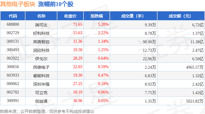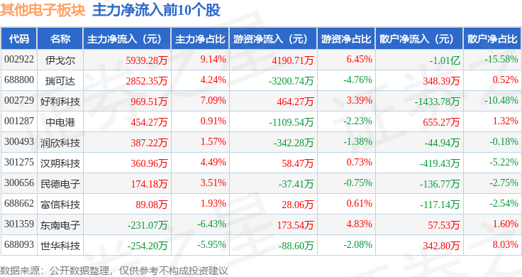 从资金流向上来看,当日其他电子板块主力资金净流出18.3亿元,游资资金净流入1.69亿元,散户资金净流入16.61亿元。其他电子板块个股资金流向见下表: