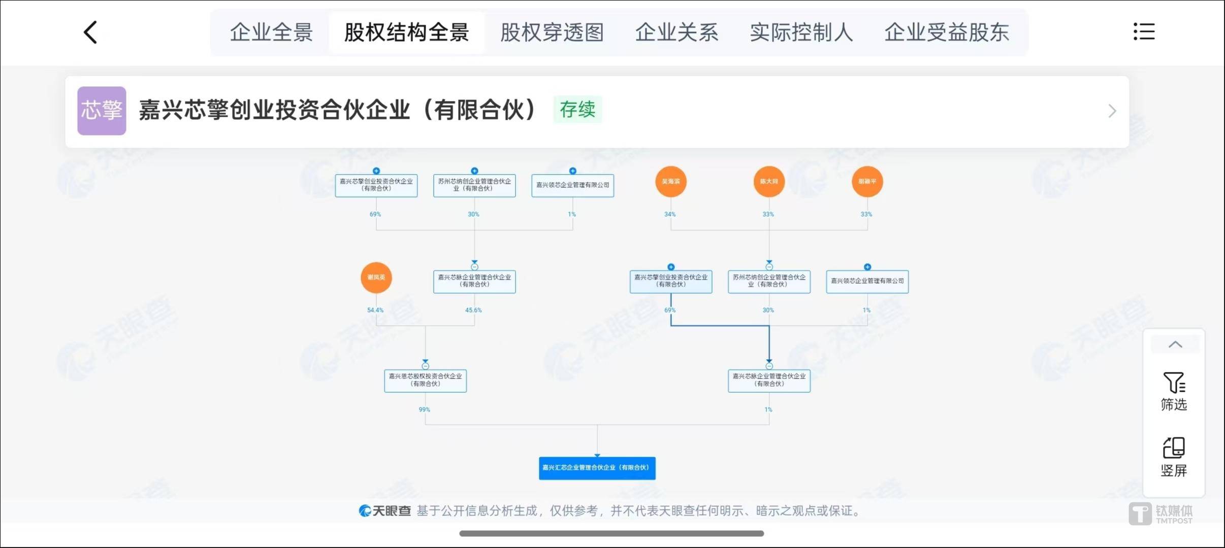 笔者通过天眼查APP穿透嘉兴汇芯的股权结构可见,不论是占股99%的嘉兴恩芯股权投资合伙企业(有限合伙)还是占股1%的嘉兴芯脉企业管理合伙企业(有限合伙),其中都有苏州芯纳创企业管理合伙企业(有限合伙)(以下简称“苏州芯纳”)的持股。