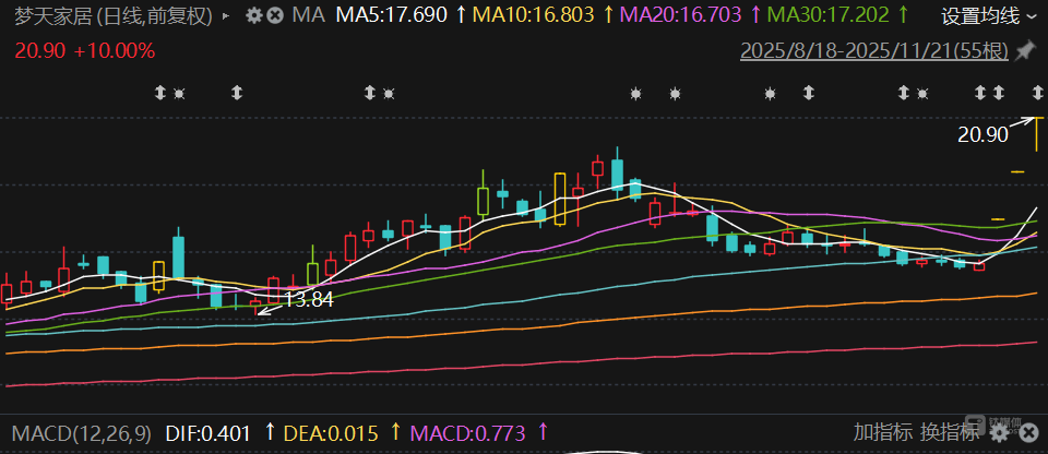 在近日震荡下行的A股市场中,正深陷业绩困境的木门龙头梦天家居(603216)却走出独立行情——连续斩获三个涨停板,11月21日收盘价报20.09元,创下近三年新高,总市值也随之攀升至46.54亿元。