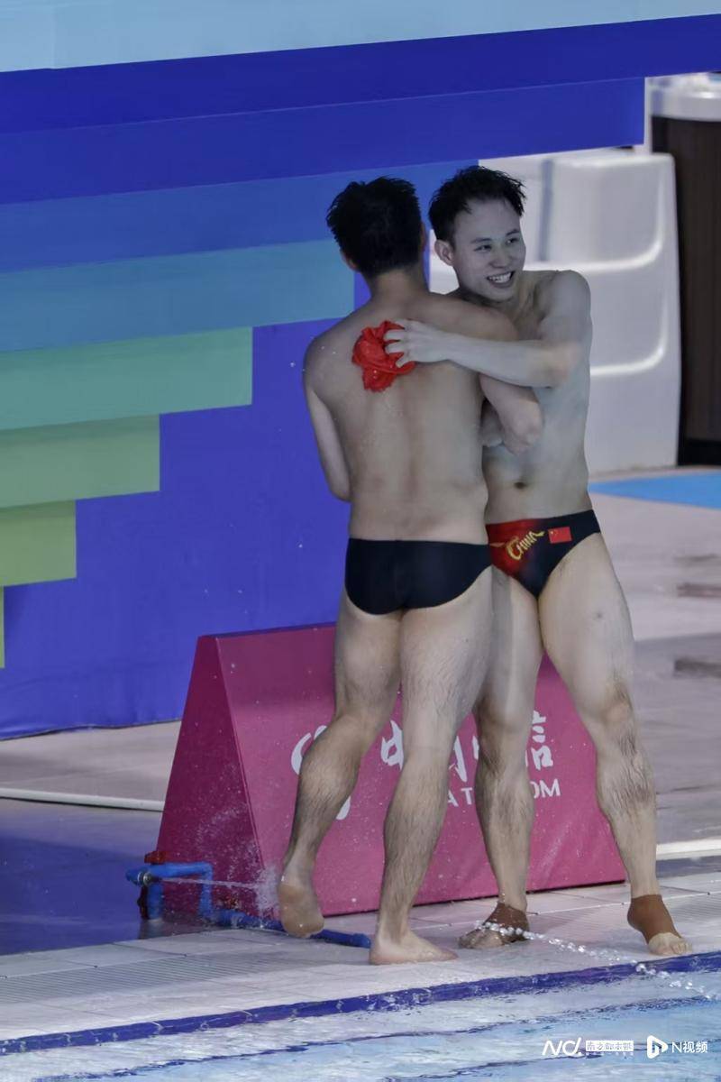 谢思埸在夺得跳水男子双人三米板金牌后拥抱搭档黄博文。