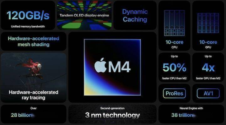 具体而言,M4 芯片的 CPU 核心数从 8 个增加到最多 10 个,CPU 速度比 M3 快了 30%,GPU 速度则快了 21%。