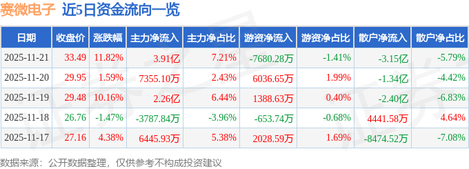 证券之星消息,截至2025年11月21日收盘,赛微电子(300456)报收于33.49元,上涨11.82%,换手率27.87%,成交量166.51万手,成交额54.31亿元。