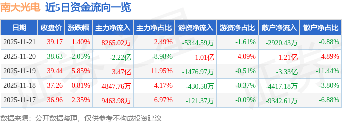 证券之星消息,截至2025年11月21日收盘,南大光电(300346)报收于39.17元,上涨1.4%,换手率12.72%,成交量83.54万手,成交额33.13亿元。