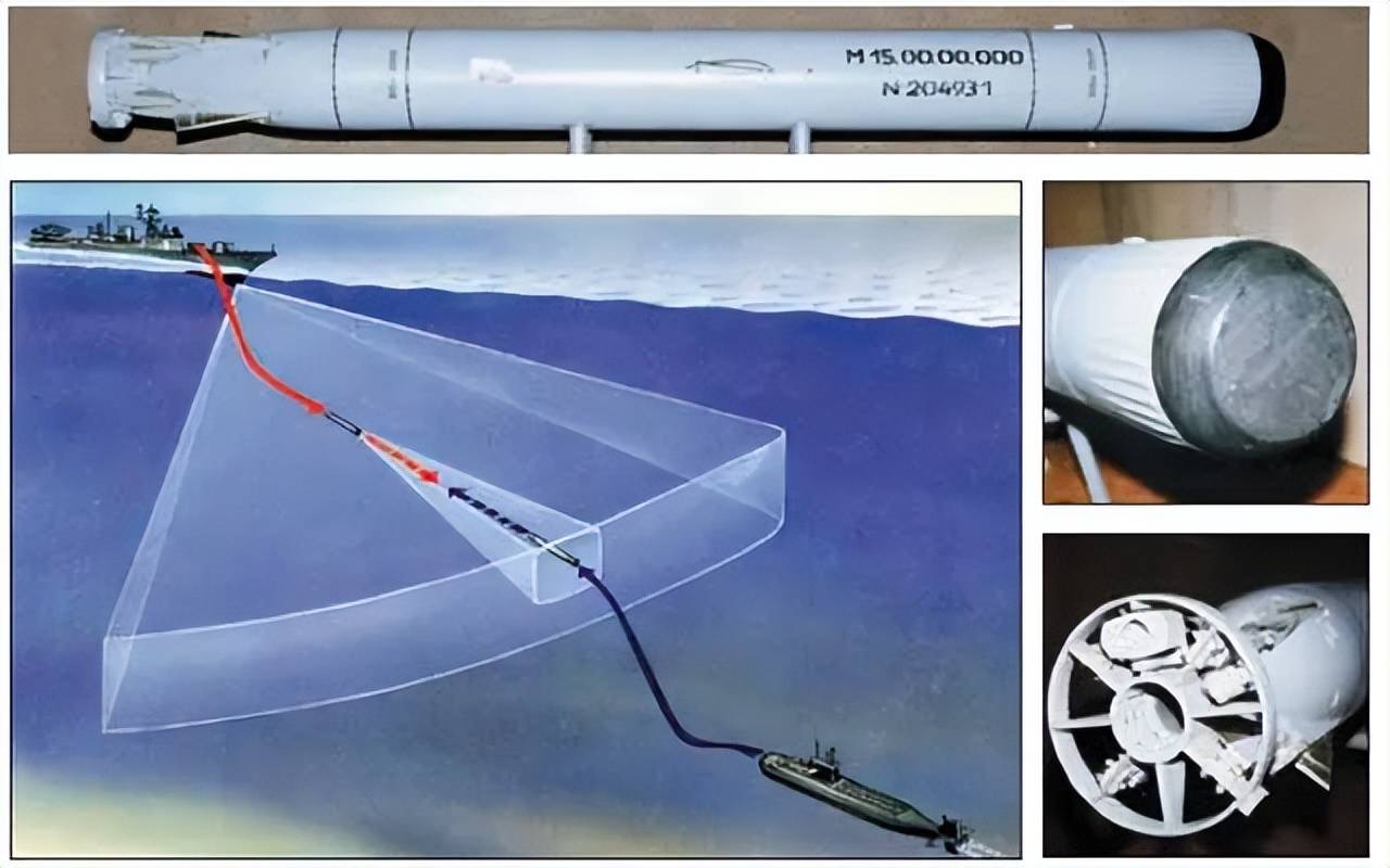 其三是反鱼雷鱼雷本身。从外形上来看,这种反鱼雷鱼雷其实本身就是一枚体量比较小的鱼雷,有制导系统,有战斗部,有动力系统。只不过相比普通的鱼雷,它的动力系统能量密度高,持续时间短。可以在短时间内达到极高的速度,但跑不了多远,能够在最后阶段挡住鱼雷就可以了。