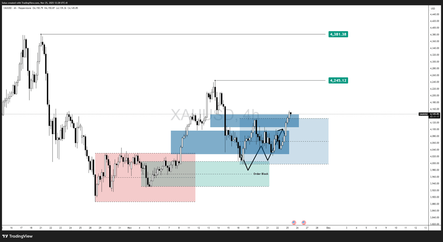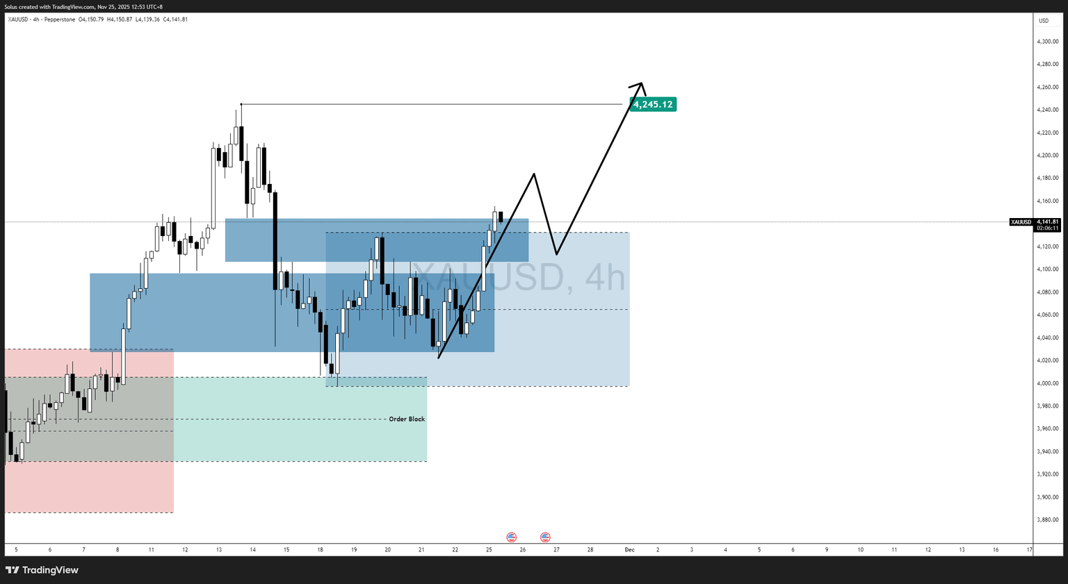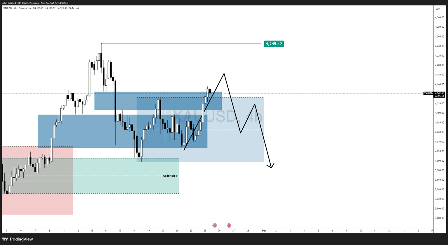 若4小时线果断收于4160美元上方,将确认买方已消化供应压力,预示上涨延续。