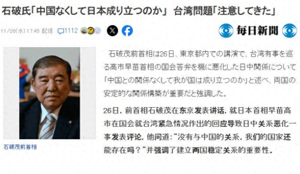 然而,这番言论并非没有代价。在高市早苗政府愈演愈烈的对华强硬政策下,彷佛任何温和的声音都将被迅速淹没。“叛徒”、“非国民”的标签正如利剑悬于石破茂的头顶。一个敢于直面现实的政治家,是否就必须承担这样的舆论压力?