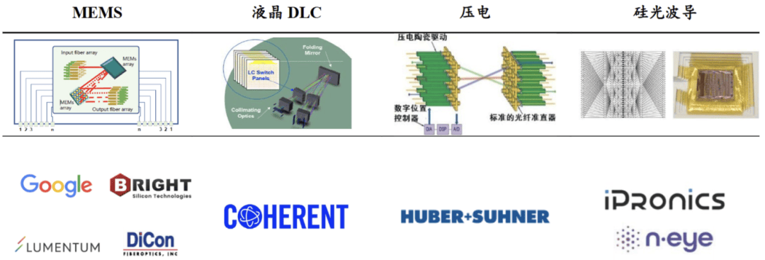 能够实现OCS的,从原理上看当前主流三种方案:分别为MEMS 微镜、数字液晶(如 LCoS/DMD 类空间光调制)、压电陶瓷(Piezo)、硅光波导等。几个技术路线都有厂商在进行尝试。目前,谷歌Palomar OCS 基于MEMS 方案,通过2D 光纤准直器阵列进入光学核心,采用2D MEMS 反射镜达到折叠光路的效果。