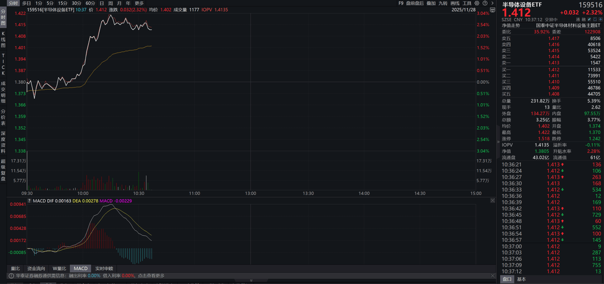 11月28日,谷歌叙事持续发酵,AI景气度持续上行,聚焦上游半导体设备领域的半导体设备ETF(159516)盘中领涨超2.3%。