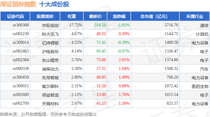 深证创投(399696)指数十大成份股详情如下: