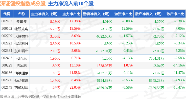 资金流向方面,深证创投(399696)指数成份股当日主力资金净流入合计6.99亿元,游资资金净流入合计1.84亿元,散户资金净流出合计8.83亿元。成份股资金流向详情见下表: