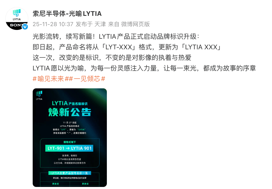 如上图所见,索尼半导体官方微博宣布LYTIA产品正式启动品牌标识升级:11月28日起,产品命名将从「LYT-XXX」格式,更新为「LYTIA XXX」,这一次,改变的是标识,不变的是对影像的执着与热爱。LYTIA愿以光为喻,为每一份灵感注入力量,让每一束光,都成为故事的序章。