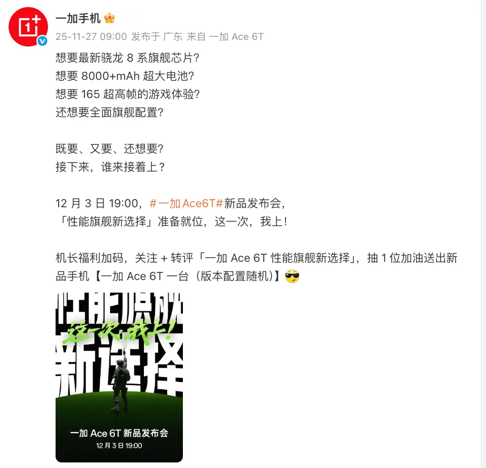 首先是一加的Ace6T,官方已定档12月3日19点发布,应该也是12月第一款新机,目前外观配置均已有预热或者曝光,可以戳跳转回顾。个人最期待的是这次的神里绫华·原神定制版~
