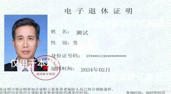 (一)电子退休证明“爱山东”APP展示样式(见附件1),底板以第三代社会保障卡的水波纹为基础,增加SDHRSS底纹。标题“电子退休证明”为华文中宋,正文信息栏、注释信息栏为宋体。照片调取自社会保障卡照片。正文信息包括姓名、性别、身份证号码、退休时间(精确到年月),加盖“山东省人力资源和社会保障厅离退休专用章”,注释包括“此证明主要证明参加企业职工基本养老保险人员已符合待遇领取条件”“退休时间是指符合领取基本养老保险待遇条件时间”和“查询时间”内容。
