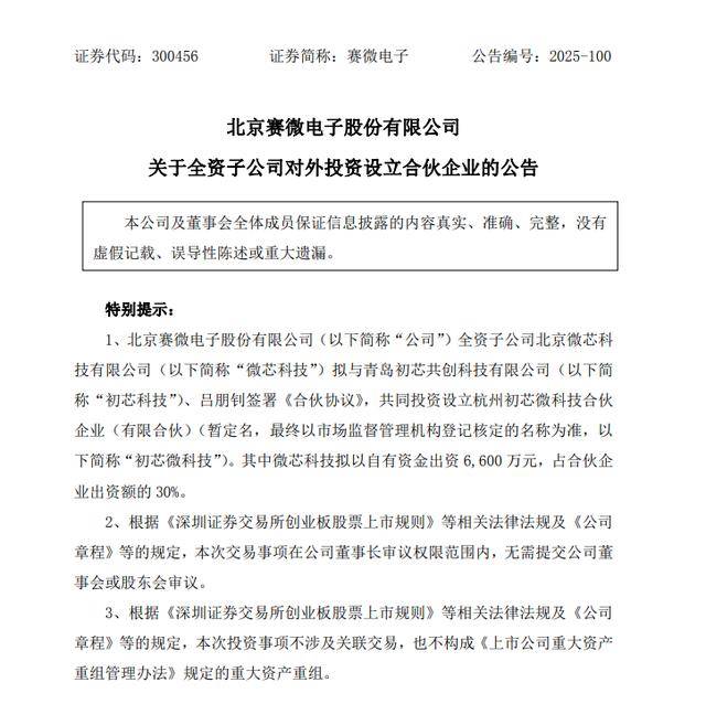 12月3日,赛微电子(300456.SZ)公告称,公司全资子公司微芯科技拟与初芯科技、吕朋钊签署《合伙协议》,共同投资设立初芯微科技,其中微芯科技拟以自有资金出资6600万元,占合伙企业出资额的30%。本次交易事项在公司董事长审议权限范围内,无需提交公司董事会或股东会审议。