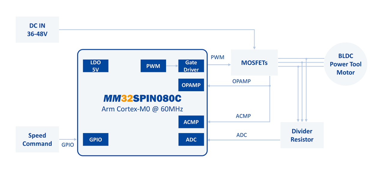 该方案的核心是MM32SPIN080C系列MCU,它基于高性能的Arm®Cortex-M0内核,工作频率最高可达60MHz,为复杂的电机控制算法提供了充足的算力保障。32位单片机存储资源配备32KB Flash和4KB SRAM,足以应对热水器控制系统中的程序代码和数据存储需求。