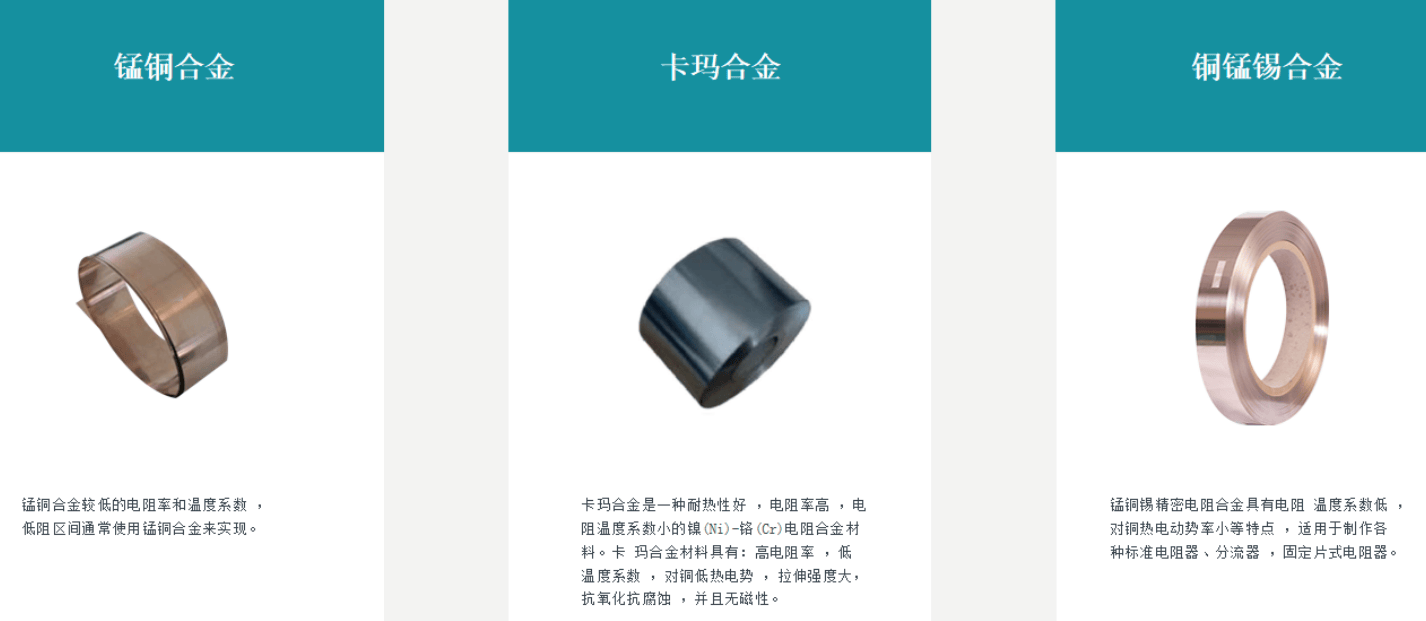 通过调整镍、铬、锰、铜等元素的配比,可精准调控电阻的核心参数。例如,锰铜合金具备较低的电阻率和温度系数,在低阻区间通常采用锰铜合金来实现;卡玛合金则拥有高电阻率、低温度系数、对铜低热电势、拉伸强度大、抗氧化抗腐蚀且无磁性等优势;锰铜锡精密电阻合金则以电阻温度系数低、对铜热电动势率小等特点,适用于制作各类标准电阻器、分流器及固定片式电阻器。