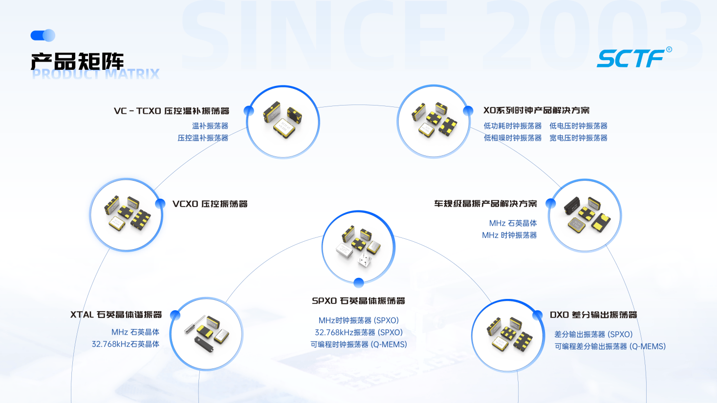 产品线上,星通时频覆盖齐全:从基础的石英晶体谐振器,到差分振荡器(DXO)、压控振荡器(VCXO)、压控温补振荡器(VC-TCXO),再到全套车规级晶振解决方案,服务范围横跨消费电子、工业、医疗及汽车电子等多个领域。