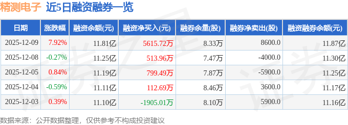 精测电子融资融券信息显示,融资方面,当日融资买入1.75亿元,融资偿还1.19亿元,融资净买入5615.72万元,连续3日净买入累计6929.18万元。融券方面,融券卖出2.3万股,融券偿还1.44万股,融券余量8.33万股,融券余额606.17万元。融资融券余额11.87亿元。