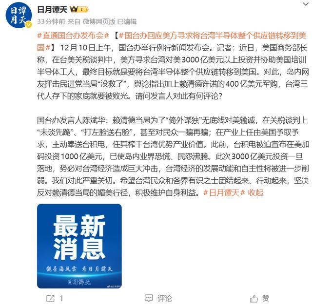记者:近日,美国商务部长称,在台美关税谈判中,美方寻求台湾对美3000亿美元以上投资并协助美国培训半导体工人,最终目标就是要将台湾半导体整个供应链转移到美国。对此,岛内网友抨击民进党当局“没救了”,舆论指出加上赖清德许诺的400亿美元军购,台湾三代人存下的家底就要被败光。请问发言人对此有何评论?