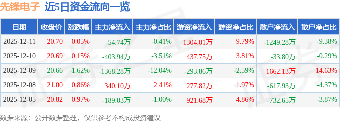 证券之星消息,截至2025年12月11日收盘,先锋电子(002767)报收于20.7元,上涨0.05%,换手率4.92%,成交量6.4万手,成交额1.33亿元。