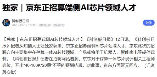 【CNMO科技消息】12月12日,据《科创板日报》报道,京东正在招募端侧AI芯片领域人才。京东此次的招聘方向主要集中在存算一体AI芯片领域,产品或将用于机器人、智能家电等硬件产品。招聘信息显示,京东为存算一体芯片设计工程师提供“40K-100K×20薪”的高额薪酬方案,具体薪酬区间取决于候选人的技术背景和项目经验。业内人士指出,京东此举正与国内外大型互联网企业抢夺AI人才的潮流同步。