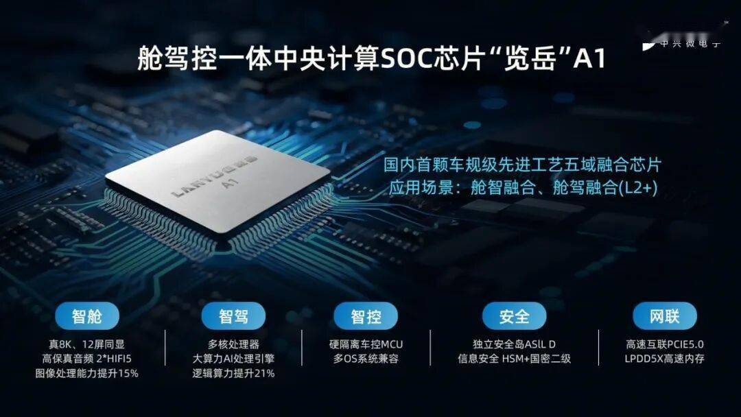 中兴微电子自主研发的舱驾控一体中央计算SOC芯片“览岳”A1,是国内首颗车规级先进工艺五域融合芯片,适用于舱智融合、舱驾融合等场景。该芯片采用舱、驾、控、网关、安全一体化系统设计,具备高算力、富连接、高集成的特点。基于多域异构设计,单芯片支持一芯十二屏、一芯五系统,支持真8K,高保真HIFI、高功能安全、端侧大模型部署等特性,满足智能座舱和L2+级辅助驾驶融合系统的各项要求。