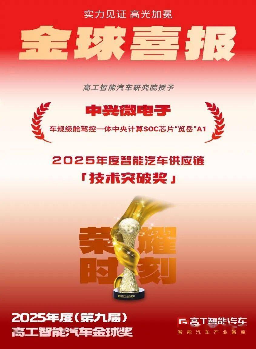 近日,2025年(第九届)高工智能汽车年会暨高工金球奖颁奖典礼在上海嘉定喜来登酒店举办,中兴微电子自研车规级舱驾控一体中央计算SOC芯片“览岳”A1荣膺高工智能汽车金球奖——年度技术突破奖。这一殊荣标志着本土芯片企业在舱驾融合单一芯片平台技术上的成功突破,实现了真正意义上的“中央计算单元”。