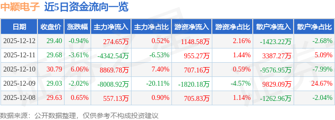 证券之星消息,截至2025年12月12日收盘,中颖电子(300327)报收于29.4元,下跌0.94%,换手率5.29%,成交量18.02万手,成交额5.32亿元。