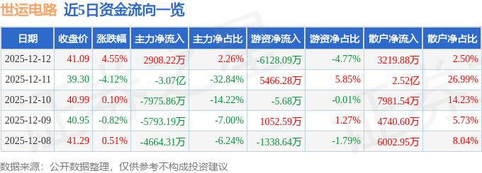 证券之星消息,截至2025年12月12日收盘,世运电路(603920)报收于41.09元,上涨4.55%,换手率4.45%,成交量32.07万手,成交额12.86亿元。