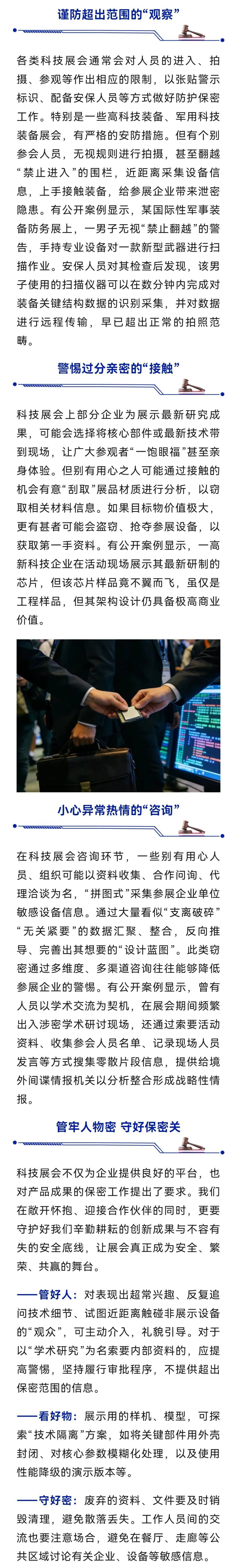 据国家安全部微信公众号消息,科技展会不仅是企业开拓市场、合作成交的黄金舞台,也是各国尖端技术的“超级秀场”。然而,汇聚大量前沿科技的展台背后,窃密黑手无声接近,一场关乎国家安全的暗战正悄然上演。