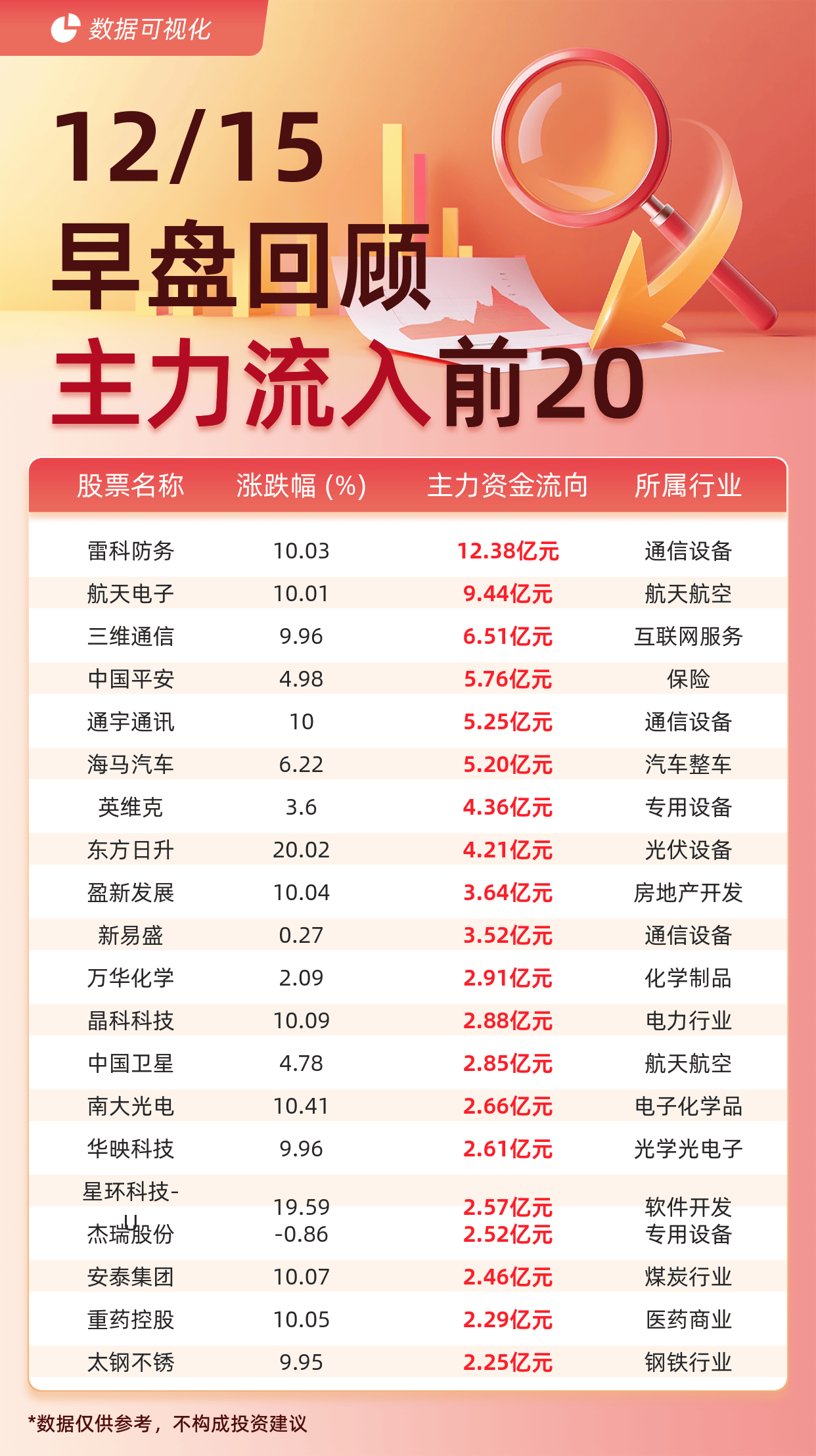 据交易所数据显示,截至12月15日午间收盘,主力资金流入前20的股票分别为: 雷科防务(12.38亿元)、 航天电子(9.44亿元)、 三维通信(6.51亿元)、 中国平安(5.76亿元)、 通宇通讯(5.25亿元)、 海马汽车(5.20亿元)、 英维克(4.36亿元)、 东方日升(4.21亿元)、 盈新发展(3.64亿元)、 新易盛(3.52亿元)、 万华化学(2.91亿元)、 晶科科技(2.88亿元)、 中国卫星(2.85亿元)、 南大光电(2.66亿元)、 华映科技(2.61亿元)、 星环科技U(2.57亿元)、 杰瑞股份(2.52亿元)、 安泰集团(2.46亿元)、 重药控股(2.29亿元)、 太钢不锈(2.25亿元)。