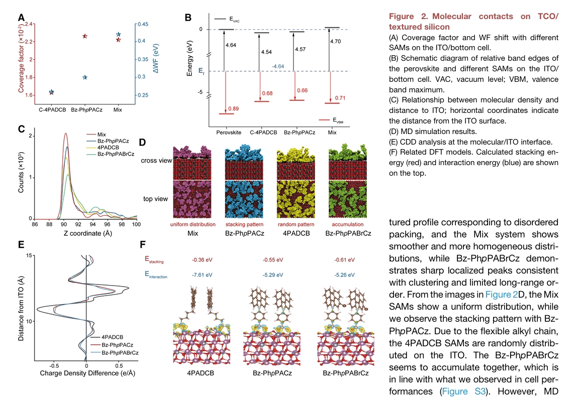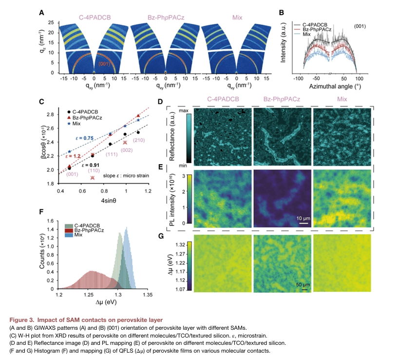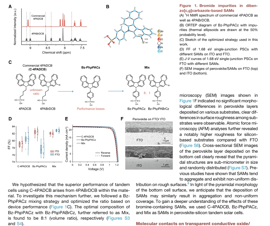 在对采用C-4PADCB与Bz-PhpPACz的钙钛矿/硅叠层电池开展初步筛选实验时,研究团队观察到C-4PADCB基器件表现出更优异的性能,后续溯源发现这一现象源于材料中存在的溴杂质。这一意外发现为后续分子设计提供了重要启发,基于该关键发现,团队设计并合成了溴取代的4PADCB衍生物——Bz-PhpPABrCz(即(4-(5-溴-7H-二苯并[c,g]咔唑-7-基)苯基)膦酸),并将其与Bz-PhpPACz(即(4-(7H-二苯并[c,g]咔唑-7-基)苯基)膦酸)共混,构建出二元混合自组装分子层(Mix SAM, Mixed Self-Assembled Monolayer),成功在织构化界面实现了更高效的空穴提取与缺陷钝化效果。