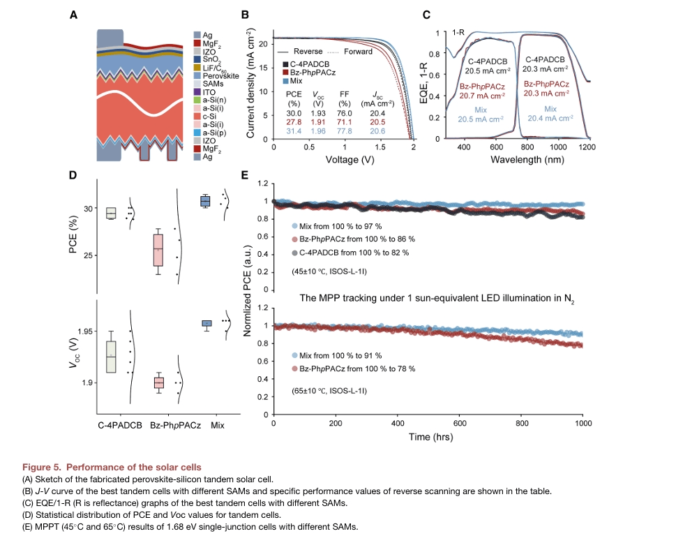 器件性能测试结果显示,基于该混合自组装分子层的器件,填充因子与光电转换效率显著提高;对宽带隙单结器件的稳定性测试也证实,含共轭连接基团的自组装分子层可赋予器件更优异的稳定性。