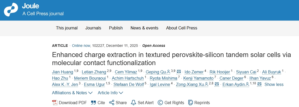 Jian Huang,Letian Zhang,Cem Yilmaz,Geping Qu,Ido Zemer,Rik Hooijer,Siyuan Cai,Ali Buyruk,Hao Zhu,Meriem Bouraoui,Achim Hartschuh,Ryota Mishima, Kenji Yamamoto7, Caner Deger,Ilhan Yavuz,Alex K.-Y. Jen,Esma Ugur,Stefaan De Wolf,Igal Levine, Zong-Xiang Xu,Erkan Aydin