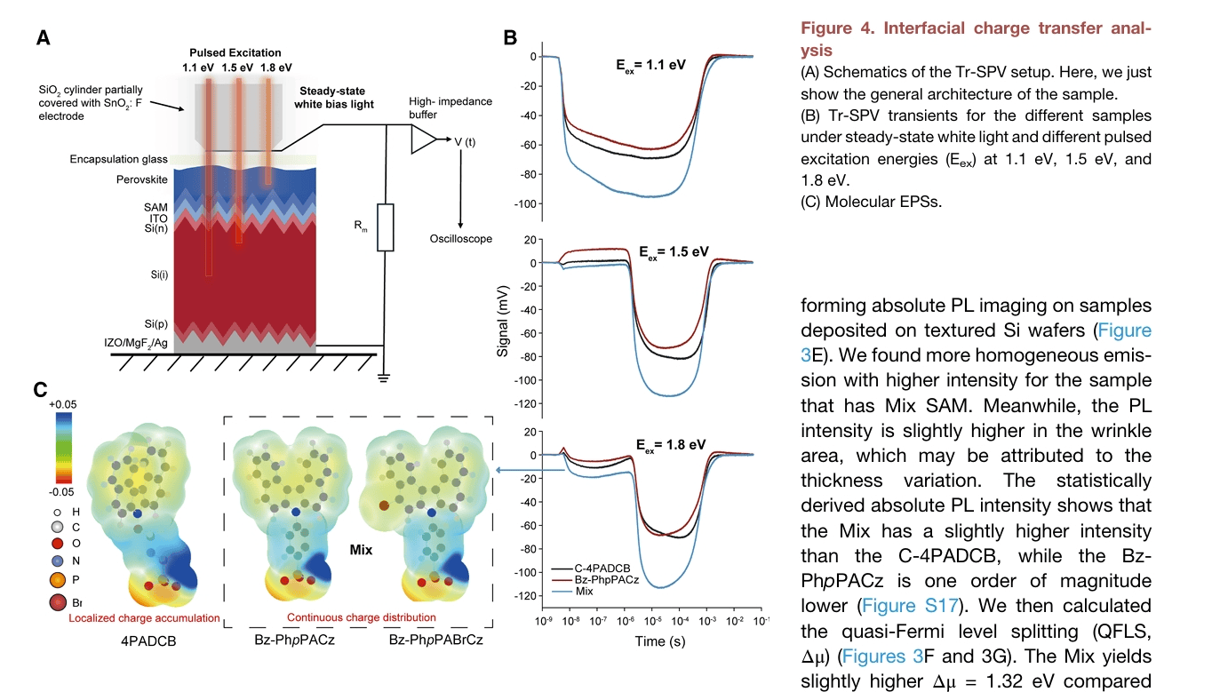 实验与计算分析结果表明,共轭型自组装分子因其较强的分子间相互作用,以及在氧化铟锡(ITO)基底上较高的堆积能,可在织构化硅基底表面形成更致密的覆盖层。因此,沉积于混合自组装分子层与C-4PADCB层上的钙钛矿薄膜,晶格应变减小、表面褶皱减少,结晶质量显著提升。研究团队采用的瞬态表面光电压(Tr-SPV)分析技术进一步证实,混合自组装分子层基钙钛矿薄膜具备高效电荷提取能力,这得益于共轭连接基团对光生空穴的高效分离作用;而溴取代修饰则可进一步强化粗糙织构化表面的界面钝化与空穴提取效率。